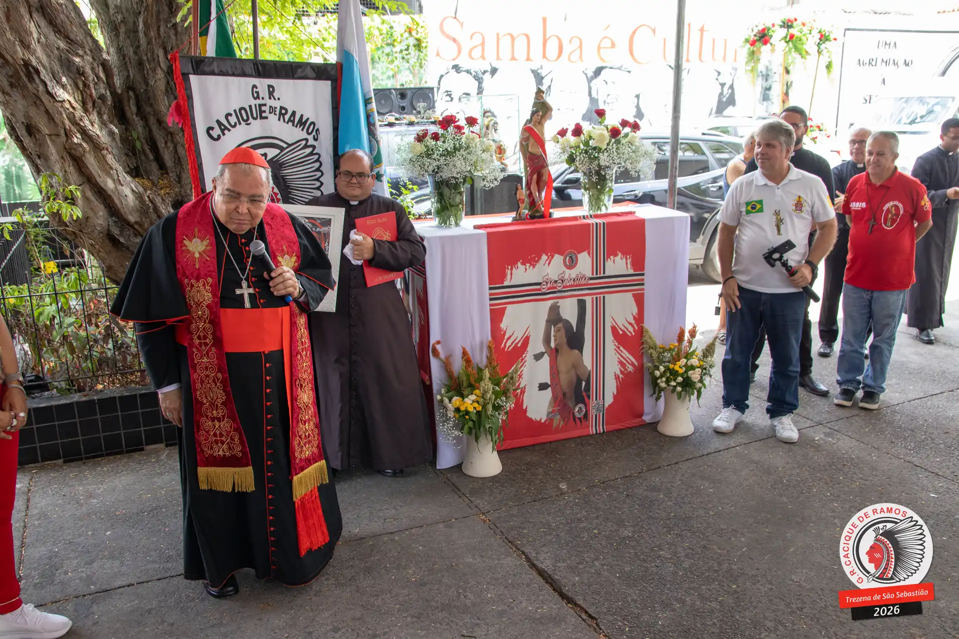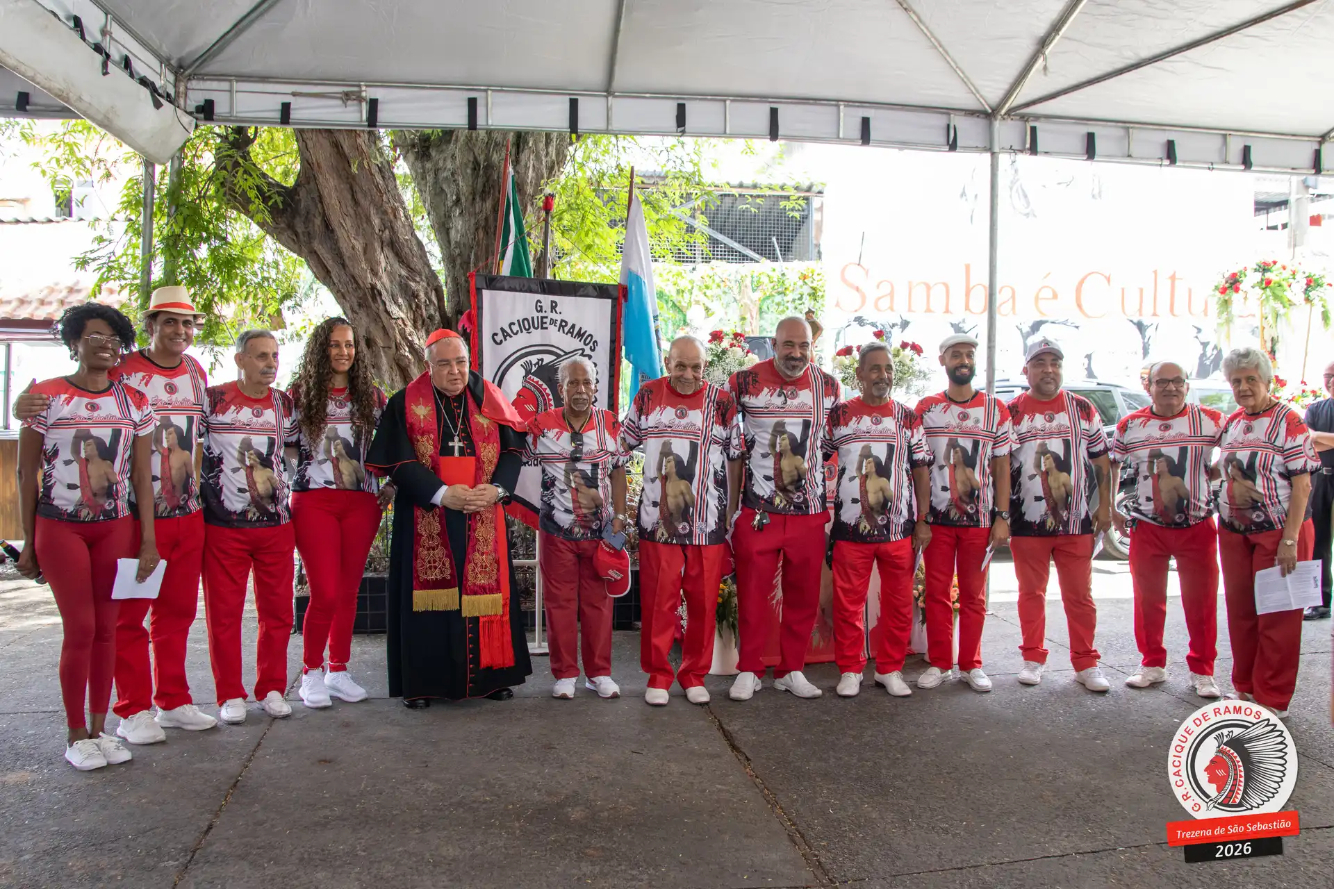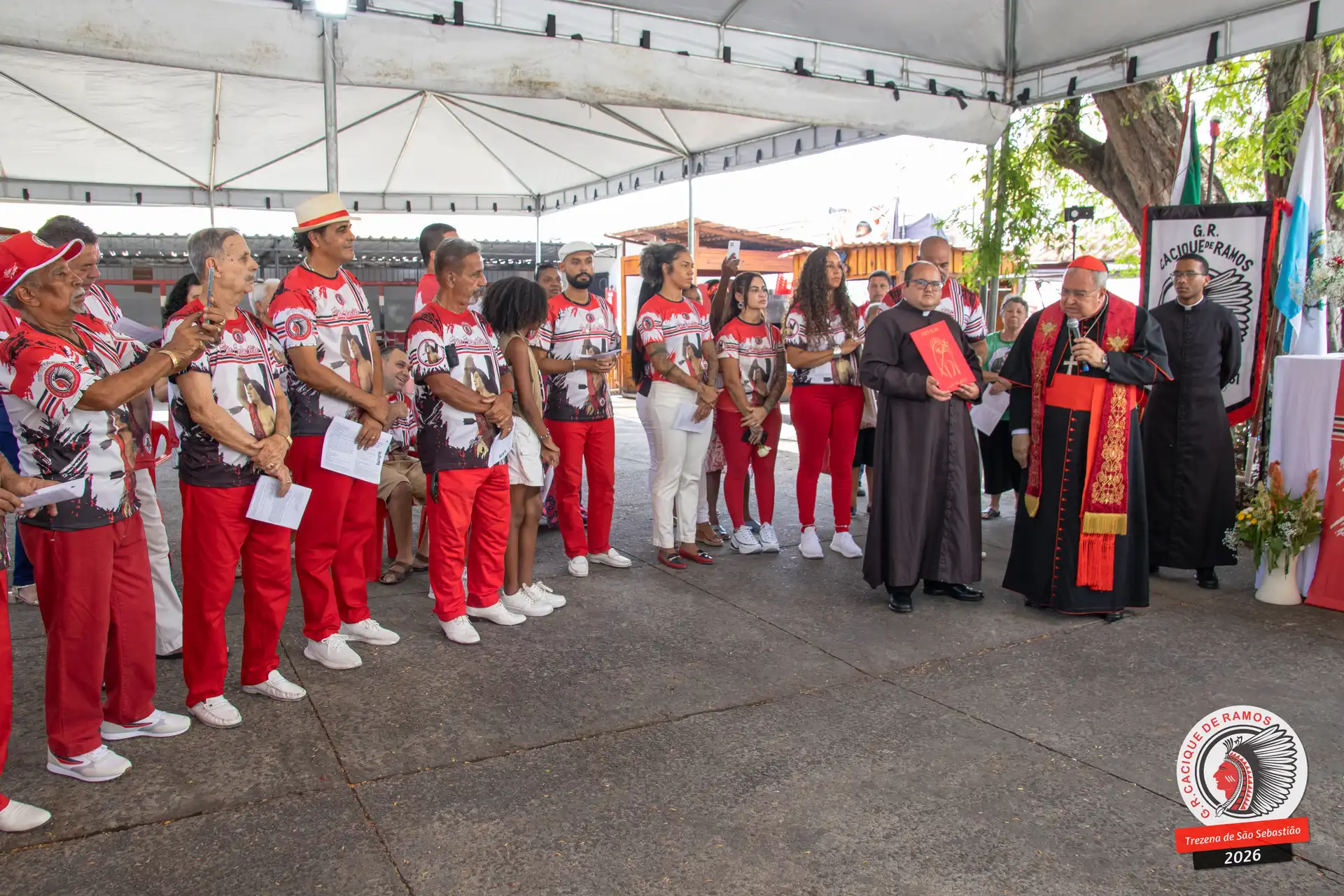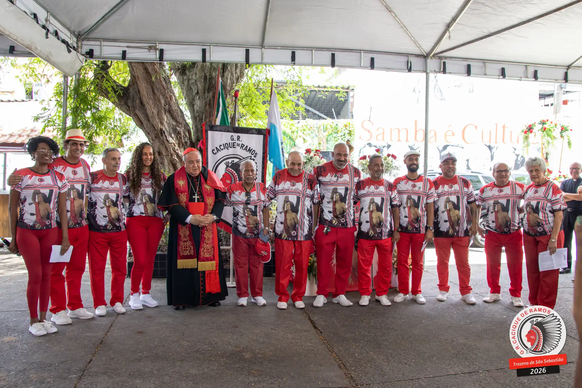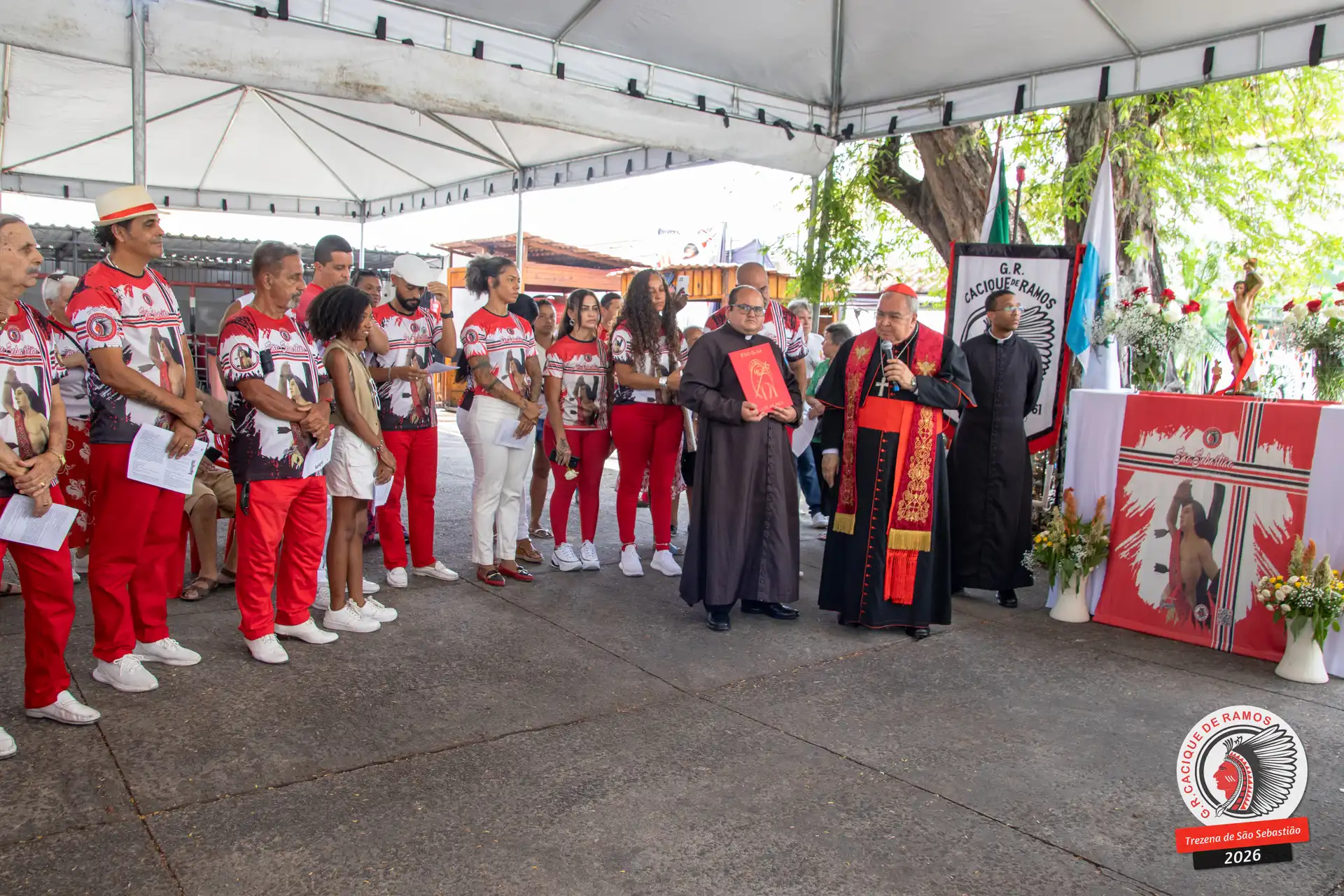 A semana de aniversário do Grêmio Recreativo Cacique de Ramos, em 2026, começou no sábado, 17 de janeiro, durante o 11º dia da Trezena de São Sebastião. O pátio das Tamarineiras foi o cenário da celebração que reuniu diretoria, baluartes, componentes e convidados em torno da bênção conduzida pelo Cardeal Arcebispo do Rio de Janeiro, Dom Orani João Tempesta, em veneração à imagem peregrina do padroeiro da cidade.