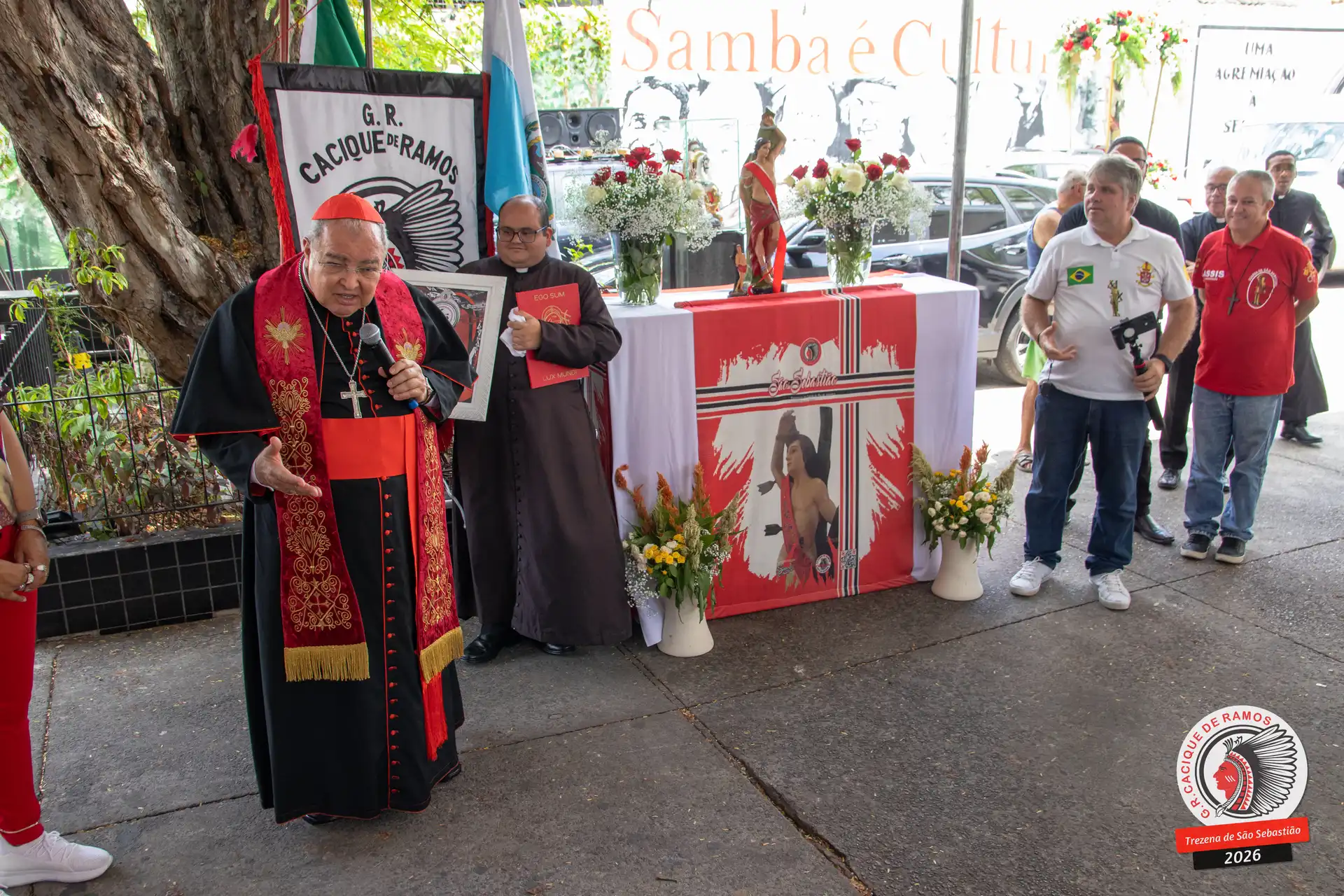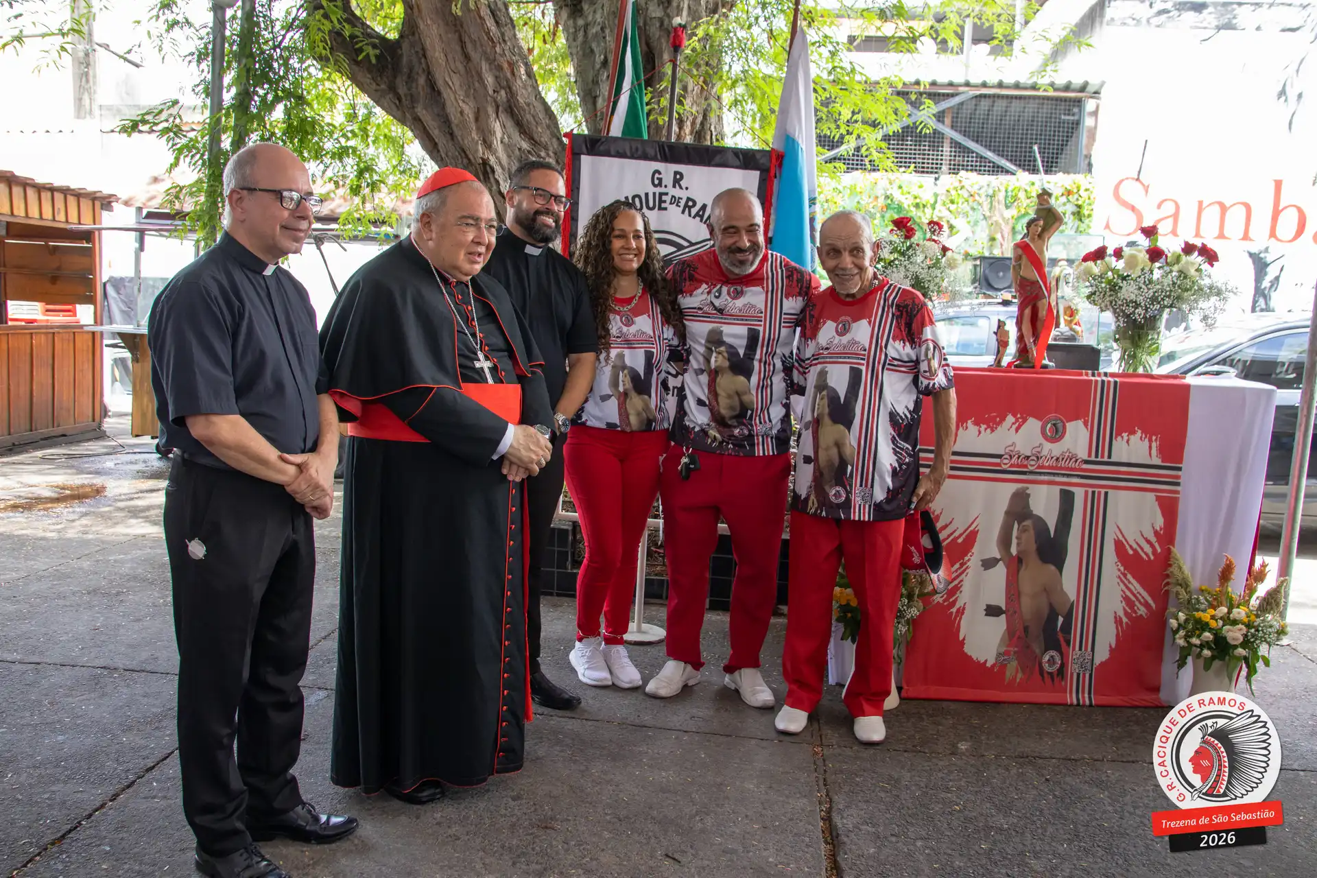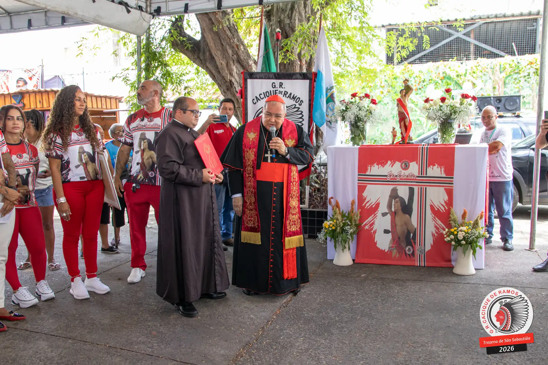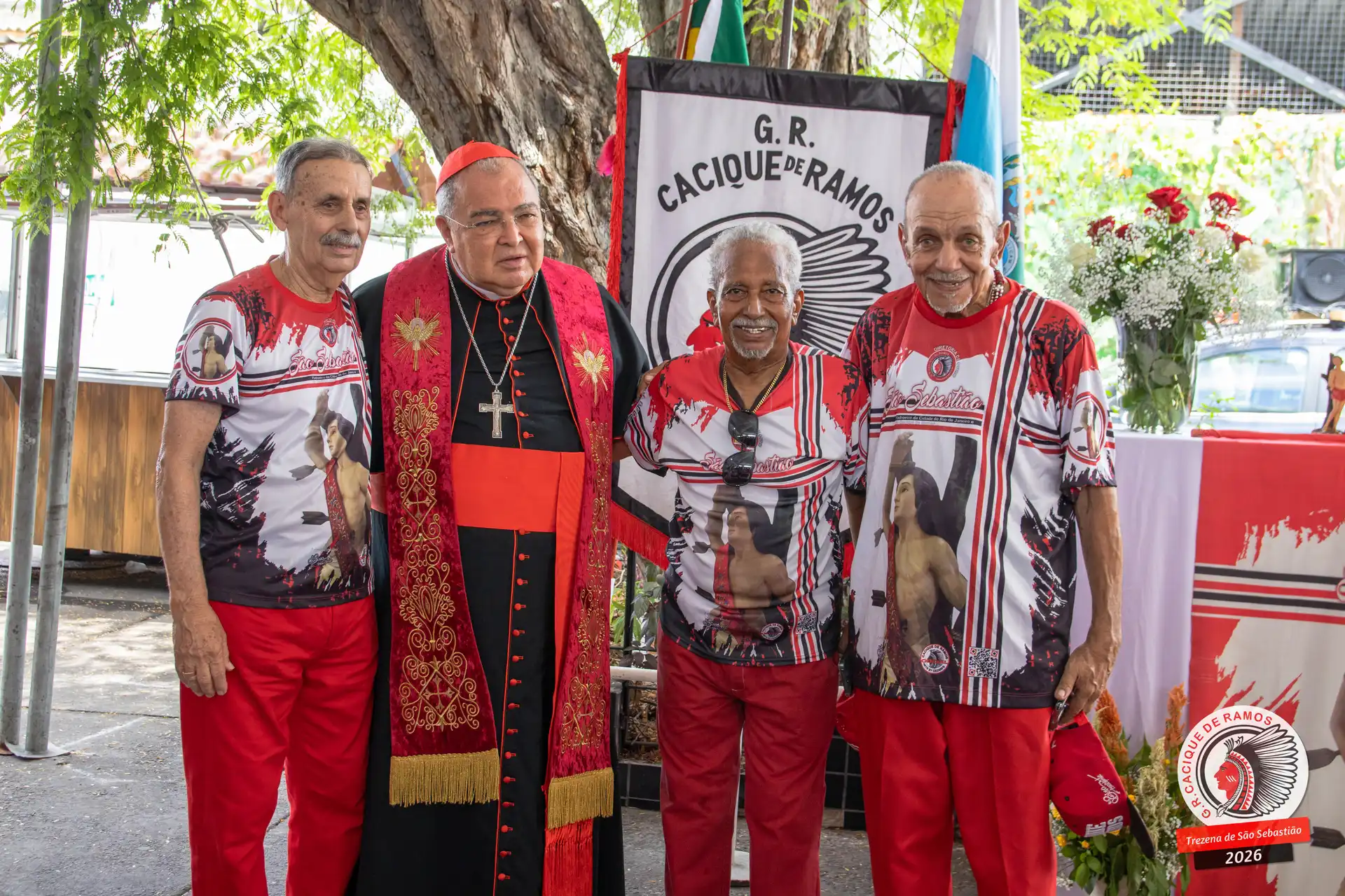 A semana de aniversário do Grêmio Recreativo Cacique de Ramos, em 2026, começou no sábado, 17 de janeiro, durante o 11º dia da Trezena de São Sebastião. O pátio das Tamarineiras foi o cenário da celebração que reuniu diretoria, baluartes, componentes e convidados em torno da bênção conduzida pelo Cardeal Arcebispo do Rio de Janeiro, Dom Orani João Tempesta, em veneração à imagem peregrina do padroeiro da cidade.