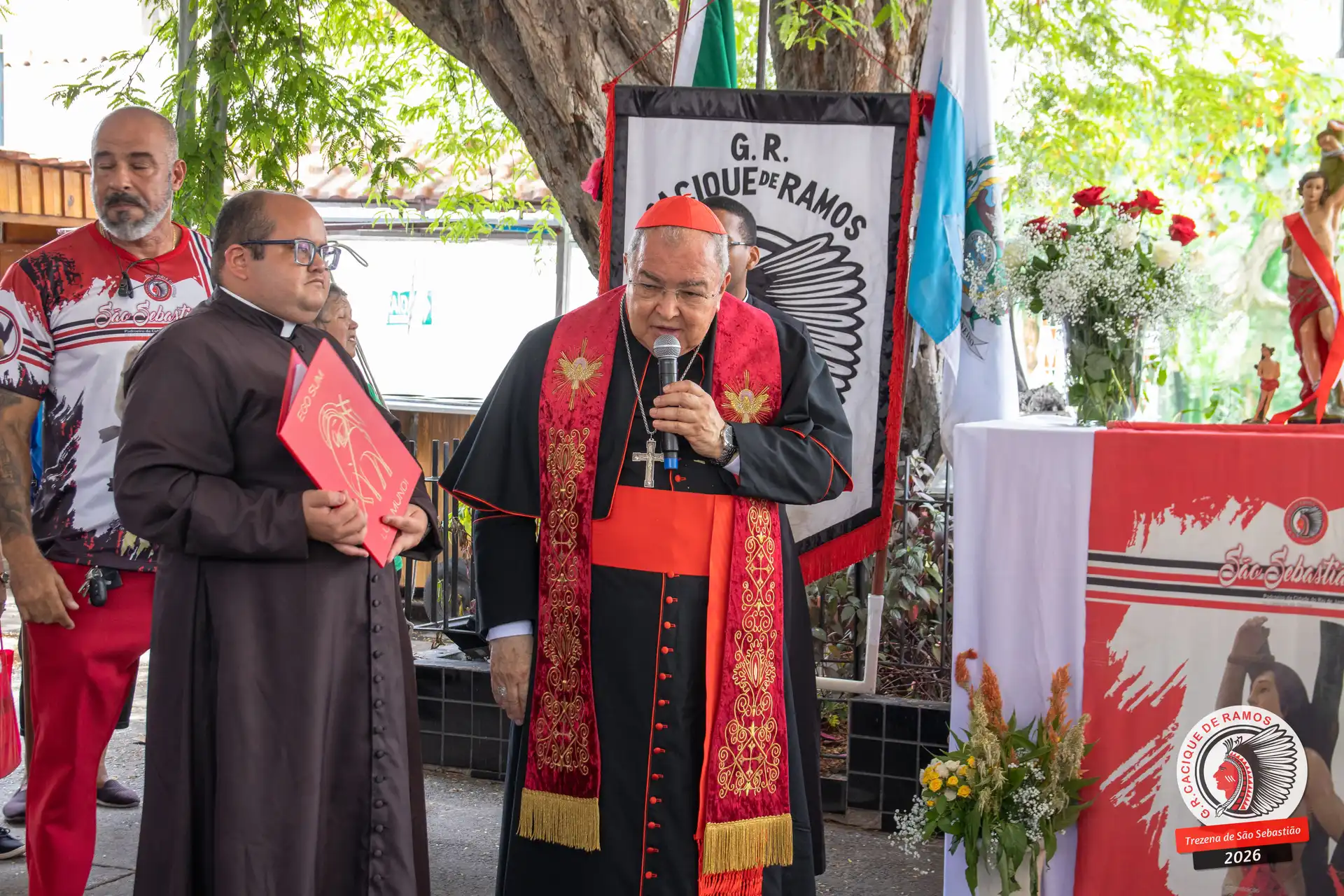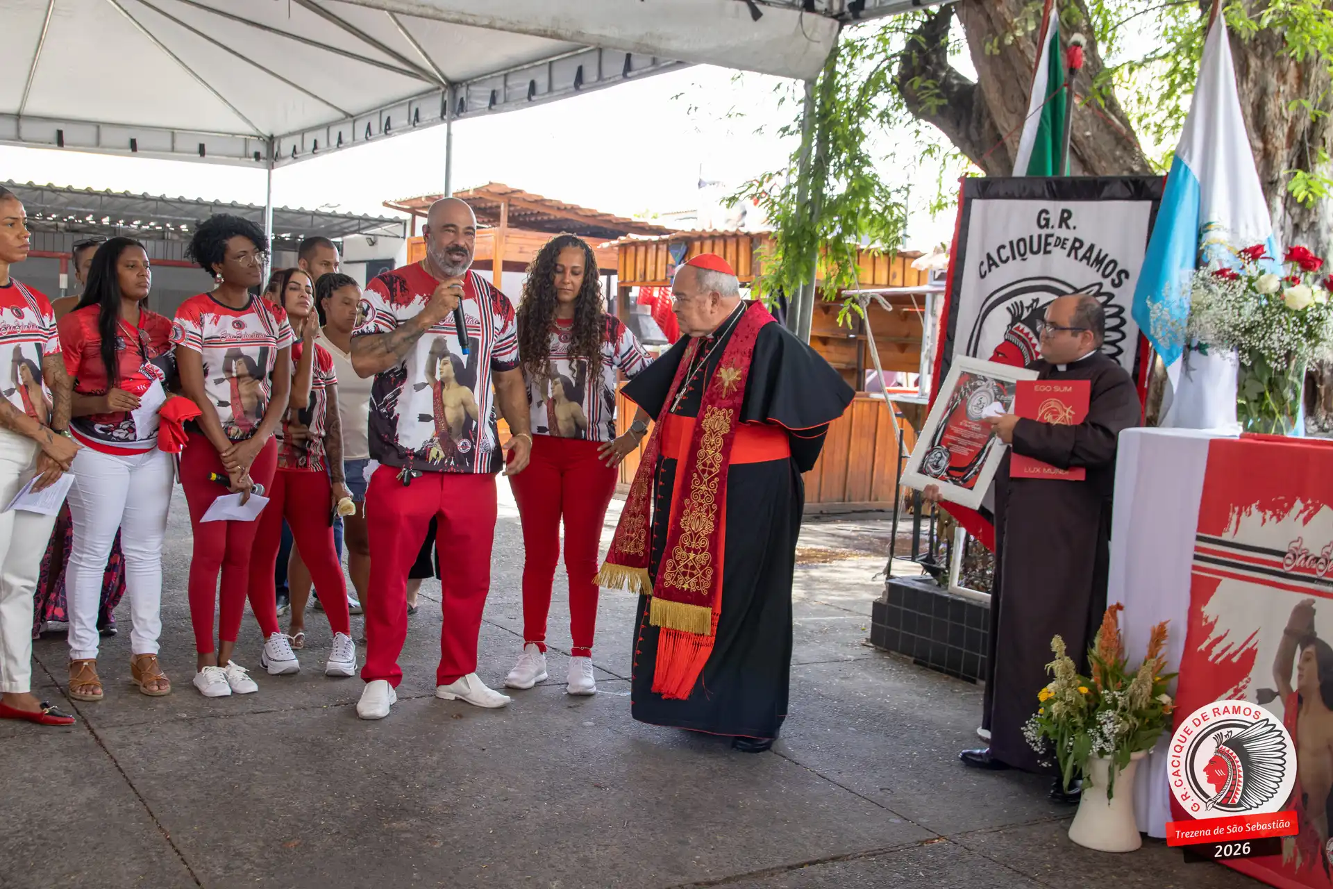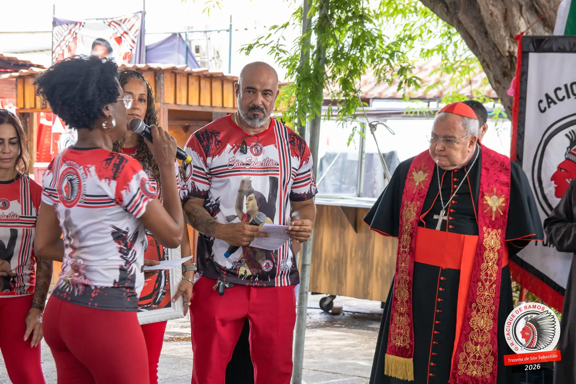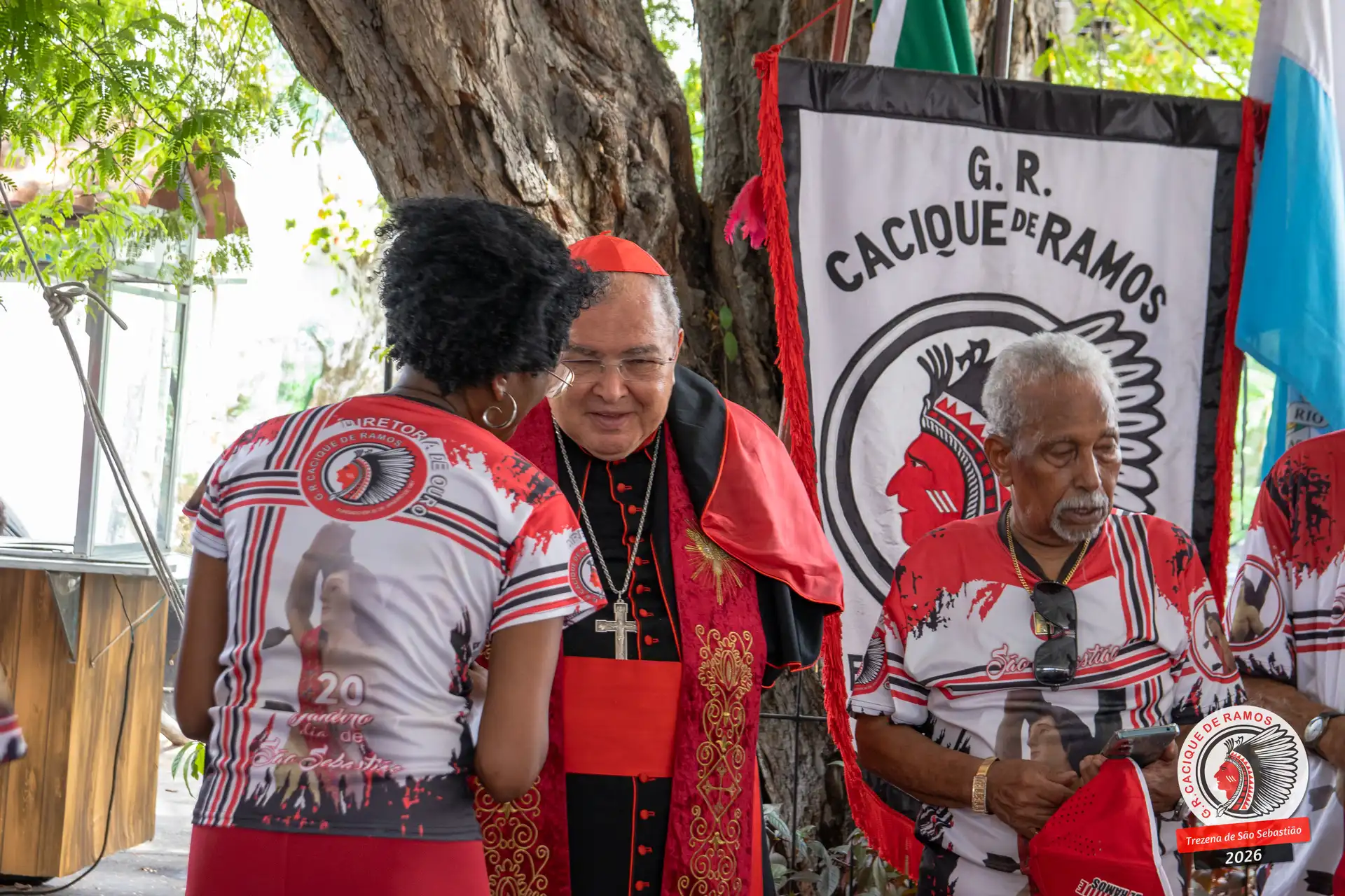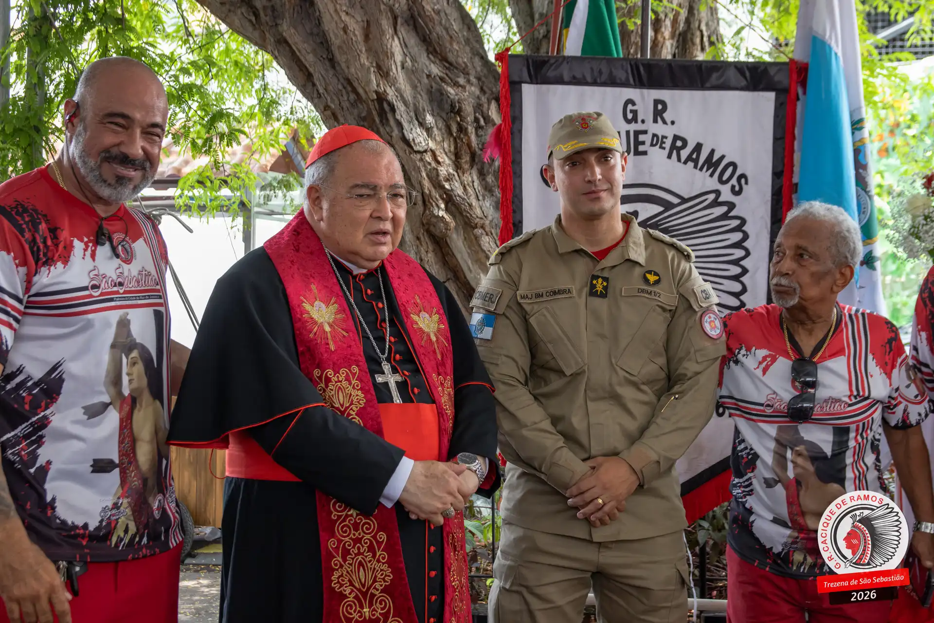 A semana de aniversário do Grêmio Recreativo Cacique de Ramos, em 2026, começou no sábado, 17 de janeiro, durante o 11º dia da Trezena de São Sebastião. O pátio das Tamarineiras foi o cenário da celebração que reuniu diretoria, baluartes, componentes e convidados em torno da bênção conduzida pelo Cardeal Arcebispo do Rio de Janeiro, Dom Orani João Tempesta, em veneração à imagem peregrina do padroeiro da cidade.
