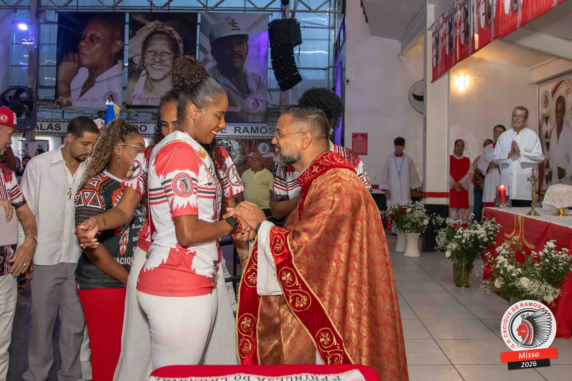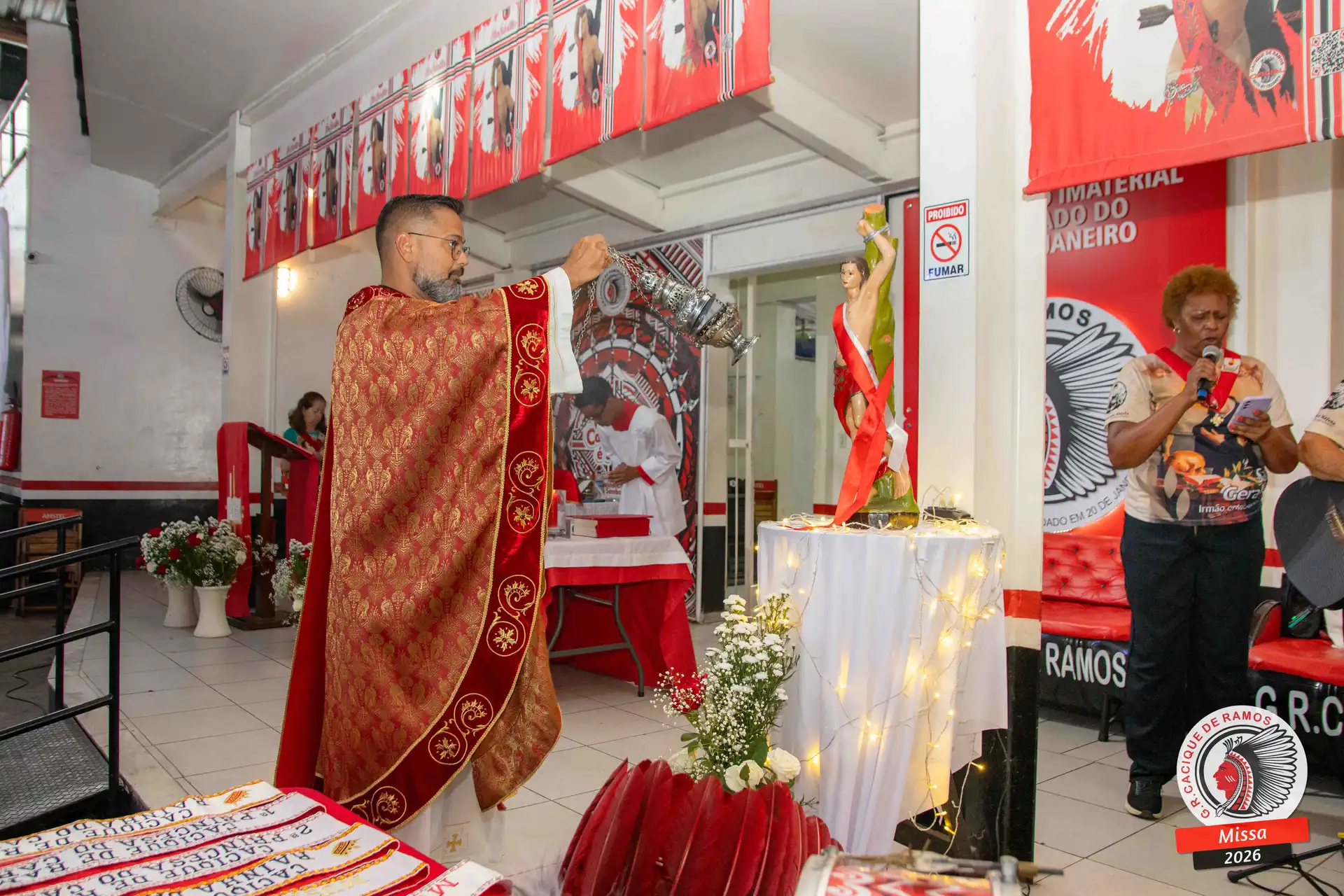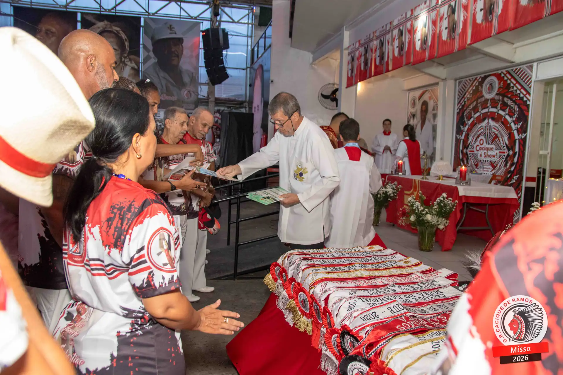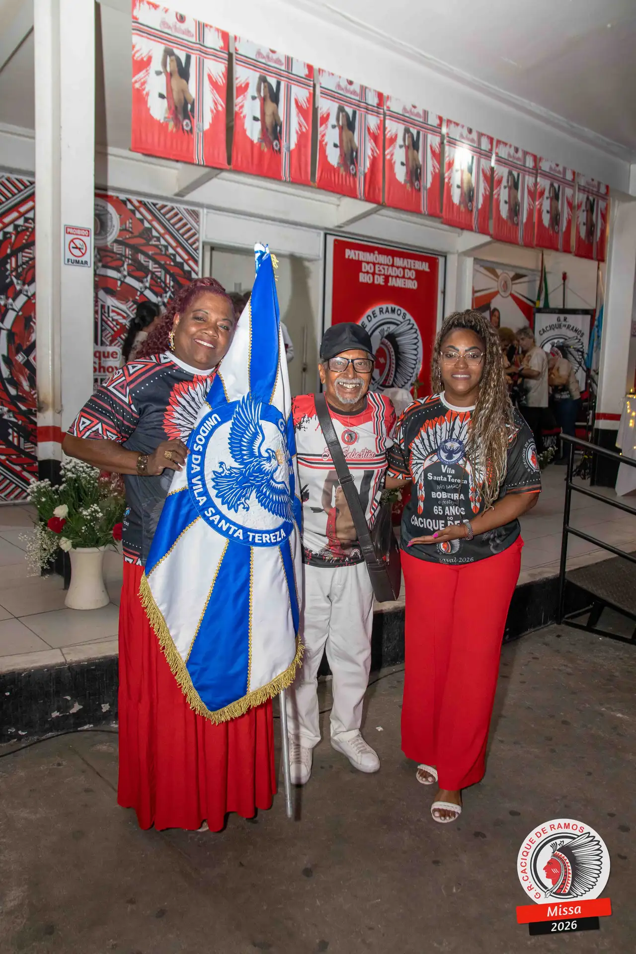 As faixas e insígnias da Corte do Carnaval do bloco foram benzidas, assim como instrumentos da Bateria Tamarindo de Ouro e do grupo Caciqueando, a camisa do grupo Quintal do Cacique e o microfone da apresentadora Nayra Cezari, bem como o pavilhão da Unidos de Vila Santa Tereza e sua diretoria, capitaneada pela presidente Patrícia Drumond. A presidente do Cacique de Ramos devolveu os pertences a seus componentes após a bênção e os parabéns cantados por todos.