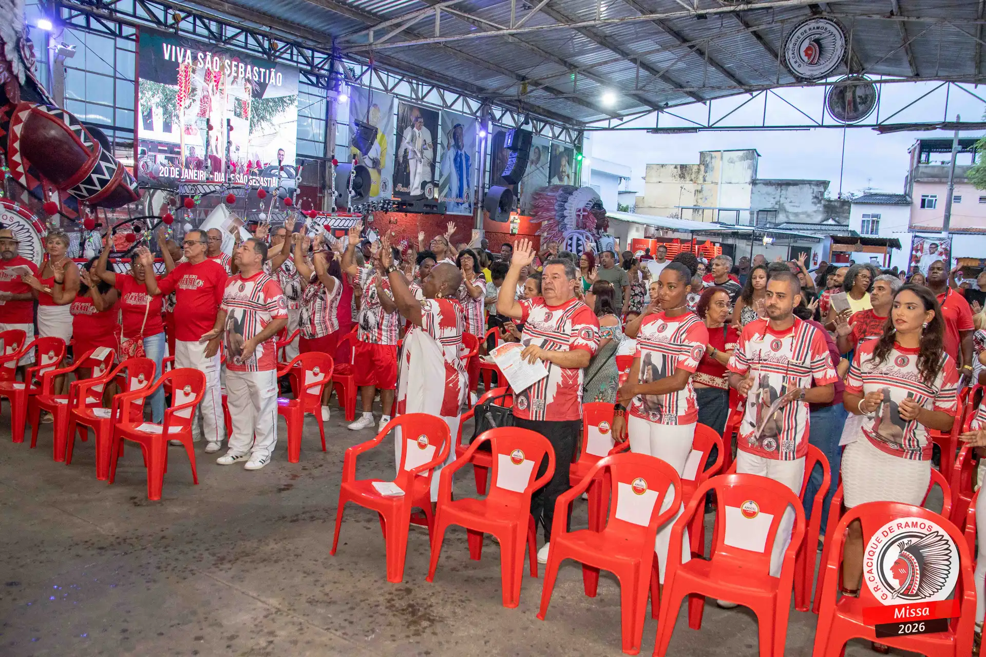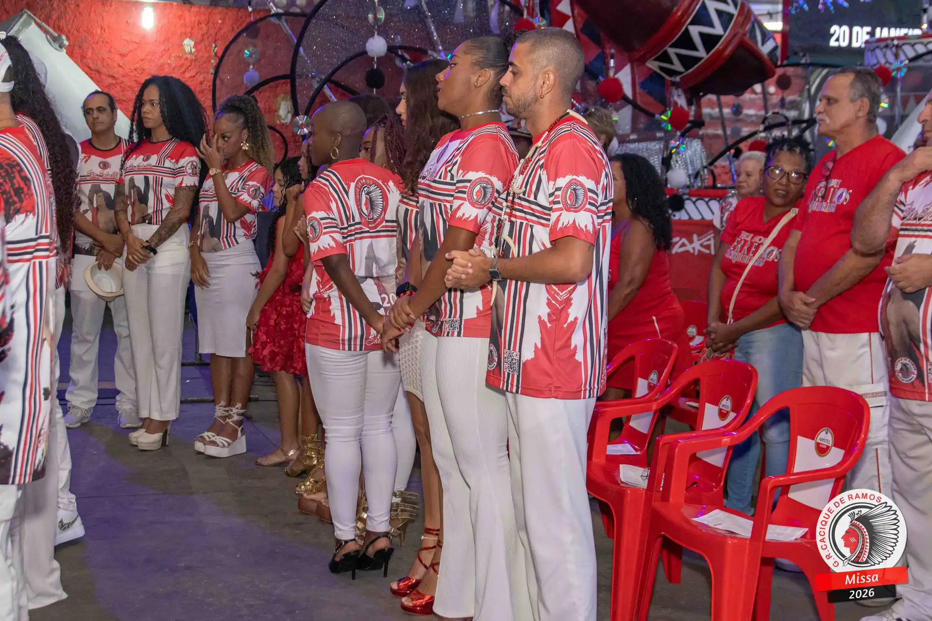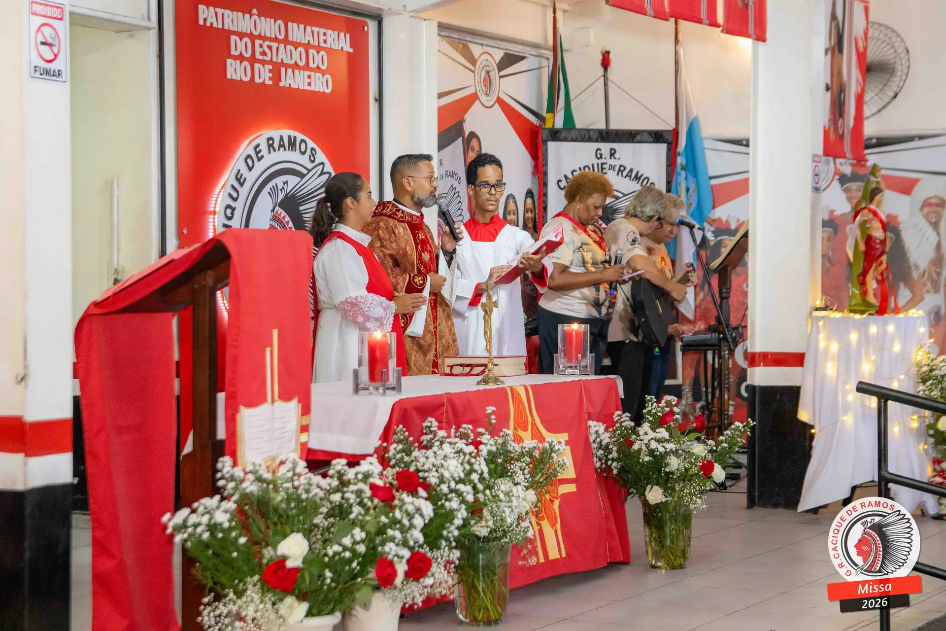 As faixas e insígnias da Corte do Carnaval do bloco foram benzidas, assim como instrumentos da Bateria Tamarindo de Ouro e do grupo Caciqueando, a camisa do grupo Quintal do Cacique e o microfone da apresentadora Nayra Cezari, bem como o pavilhão da Unidos de Vila Santa Tereza e sua diretoria, capitaneada pela presidente Patrícia Drumond. A presidente do Cacique de Ramos devolveu os pertences a seus componentes após a bênção e os parabéns cantados por todos.