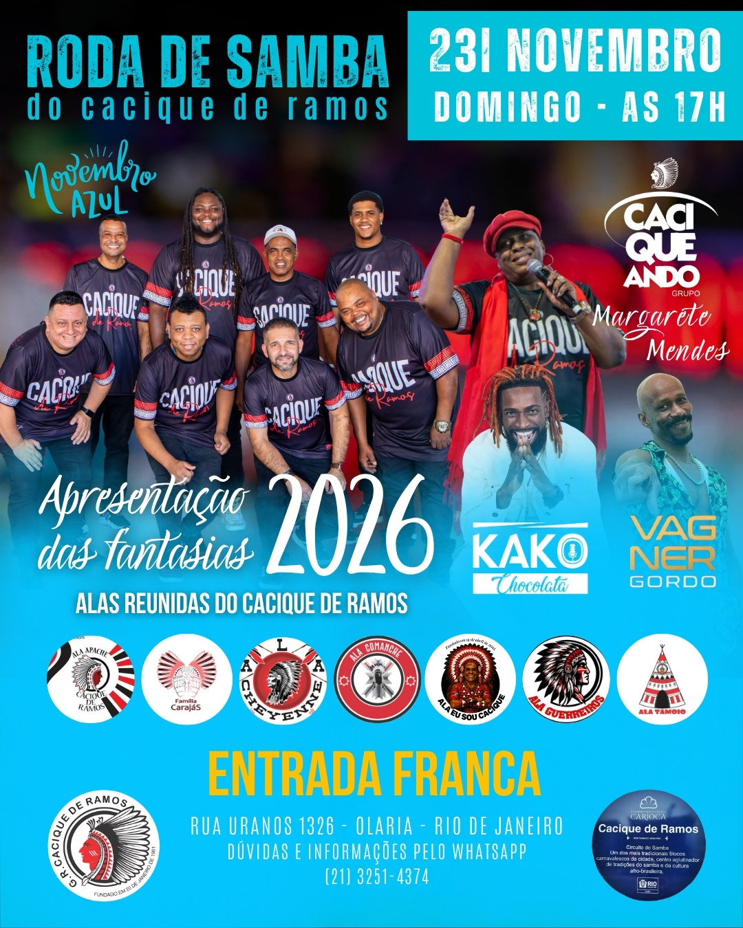 ENTRAR NA EXPOSIÇÃO visitar visitar Previous Próximo próximos eventos ùltimas notícias 9 de novembro de 2025 Cacique de Ramos realiza festa de coroação com homenagem a Bira Presidente 26 de outubro de 2025 Samba e Halloween para comemorar o sexto mês da Ala Eu Sou Cacique e os aniversariantes de outubro 12 de outubro de 2025 Dia da Padroeira do Brasil, Dia das Crianças e Dia de Roda de Samba no Doce Refúgio 5 de outubro de 2025 Outubro chegou com tudo no Cacique de Ramos 1 de outubro de 2025 Cacique de Ramos veste rosa e azul em campanha pela vida 29 de setembro de 2025 Eu fico com a pureza da resposta das crianças! É a vida, no Cacique é mais bonita 14 de setembro de 2025 Cacique de Ramos reúne caravanas e talentos em tradicional Roda de Samba 11 de setembro de 2025 Cacique de Ramos realiza primeira edição do Café da Manhã com a Presidência últimas feijoadas 19 de outubro de 2025 143ª feijoada trouxe o toque ancestral e tons de rosa neste Outubro 2025 A edição de outubro da feijoada do Cacique de Ramos, neste domingo, dia 19, foi tomada pela expectativa da família caciqueana. A Roda de Samba, … Veja mais 21 de setembro de 2025 O Cacique de Ramos deu boas-vindas à primavera neste domingo, 21 de setembro, com a realização da sua 142ª Feijoada. A estreia da tarde ficou por conta do projeto Deixa Eu Beber Em Paz, que conduziu a primeira etapa do evento a partir das 13h, ao sabor do aroma do … Veja mais 17 de agosto de 2025 Legitimidade e emoção em destaque na Feijoada nº 141 do Cacique O evento foi transmitido ao vivo no canal Koé a Boa. A alegria de viver a experiência caciqueana se manifesta a cada edição do evento, que reúne… Veja mais 20 de julho de 2025 No quesito emoção, a 140ª Feijoada gabaritou Mais um domingo repleto de amor ao samba. Assim foi o evento no domingo, 20 de julho de 2025. Inúmeras caravanas de diversas partes do país se … Veja mais 15 de junho de 2025 O dia que o Cacique de Ramos parou Primeiro, o palco vazio. O choro incontido. A falta mais presente que já se pôde sentir no lugar onde o sorriso e a alegria sempre foram realeza. … Veja mais 24 de maio de 2025 Tradição, Samba e Futuro: 138ª Feijoada do Cacique de Ramos Coroa Nova Corte Curumim e Apresenta Ala de fantasia inédita! Doce Refúgio celebrou mais um domingo memorável com feijoada, grandes shows e a apresentação das realezas mirim e adulta, além da nova ala para o … Veja mais desfiles 2024 13 de fevereiro de 2024 Carnaval 2024 - Cacique de Ramos encerra carnaval com desfile inesquecível na terça-feira gorda 12 de fevereiro de 2024 Carnaval 2024 – Cacique de Ramos reafirma território no palco oficial da Av. Chile 11 de fevereiro de 2024 Carnaval 2024 - O início de uma tríade carnavalesca do Cacique de Ramos tv cacique « Prev1 / 14Next »« Prev1 / 14Next »