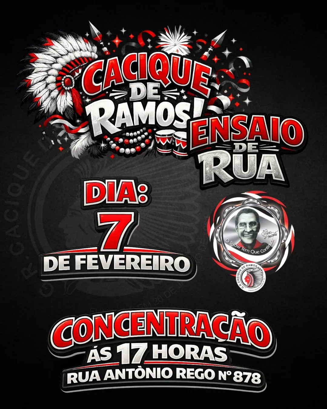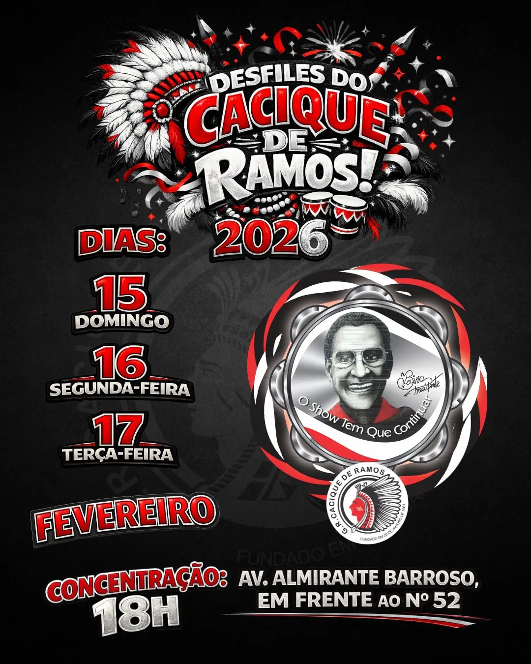 ENTRAR NA EXPOSIÇÃO visitar visitar Previous Próximo próximos eventos ùltimas notícias 27 de janeiro de 2026 Cacique de Ramos marca a despedida de janeiro com roda de samba em clima de carnaval 20 de janeiro de 2026 Dia de São Sebastião e de Missa em Ação de Graças pelos 65 anos do Cacique de Ramos 17 de janeiro de 2026 Cacique de Ramos inicia a semana dos 65 anos durante a Trezena de São Sebastião 2026 13 de janeiro de 2026 Vozes femininas conduzem o segundo domingo de 2026 no Cacique de Ramos 13 de janeiro de 2026 Cacique De Ramos deu Início á Temporada 2026 com a tradicional Roda de Samba 28 de dezembro de 2025 PASSAPORTE CARIMBADO PARA O NOVO ANO NA ÚLTIMA RODA DE SAMBA DE 2025 14 de dezembro de 2025 Roda de Samba com direito a Papai Noel, duendes e magia natalina 13 de dezembro de 2025 NOTA DE PESAR últimas feijoadas 18 de janeiro de 2026 146ª Feijoada do Cacique de Ramos fez a festa dos 65 anos do bloco com casa cheia Segundo evento dedicado à comemoração dos 65 anos do bloco recordou alguns artistas que brilharam nesta última temporada das rodas de samba e velhos… Veja mais 21 de dezembro de 2025 Feijoada do Cacique de Ramos se despediu de 2025 na 145ª edição Sob as bênçãos dos ancestrais, o evento que invoca a tradição rítmica e culinária chegou à sua última edição de 2025. A Feijoada do Cacique de Ramos… Veja mais 18 de novembro de 2025 Público lota o Cacique de Ramos na 144ª Feijoada O evento destacou o Mês da Consciência Negra, o Novembro Azul e a força cultural do Doce Refúgio.Com o aroma do feijão bem temperado espalhando-se … Veja mais 19 de outubro de 2025 143ª feijoada trouxe o toque ancestral e tons de rosa neste Outubro 2025 A edição de outubro da feijoada do Cacique de Ramos, neste domingo, dia 19, foi tomada pela expectativa da família caciqueana. A Roda de Samba, … Veja mais 21 de setembro de 2025 O Cacique de Ramos deu boas-vindas à primavera neste domingo, 21 de setembro, com a realização da sua 142ª Feijoada. A estreia da tarde ficou por conta do projeto Deixa Eu Beber Em Paz, que conduziu a primeira etapa do evento a partir das 13h, ao sabor do aroma do … Veja mais 17 de agosto de 2025 Legitimidade e emoção em destaque na Feijoada nº 141 do Cacique O evento foi transmitido ao vivo no canal Koé a Boa. A alegria de viver a experiência caciqueana se manifesta a cada edição do evento, que reúne… Veja mais desfiles 2024 13 de fevereiro de 2024 Carnaval 2024 - Cacique de Ramos encerra carnaval com desfile inesquecível na terça-feira gorda 12 de fevereiro de 2024 Carnaval 2024 – Cacique de Ramos reafirma território no palco oficial da Av. Chile 11 de fevereiro de 2024 Carnaval 2024 - O início de uma tríade carnavalesca do Cacique de Ramos tv cacique « Prev1 / 14Next »« Prev1 / 14Next »